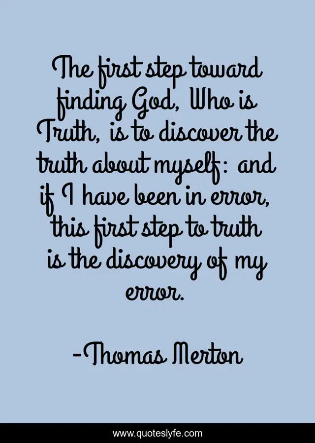 This page presents the quote "The first step toward finding God, Who is Truth, is to discover the truth about myself: and if I have been in error, this first step to truth is the discovery of my error.". Author of this quote is Thomas Merton. This quote is about god, myself, step,.