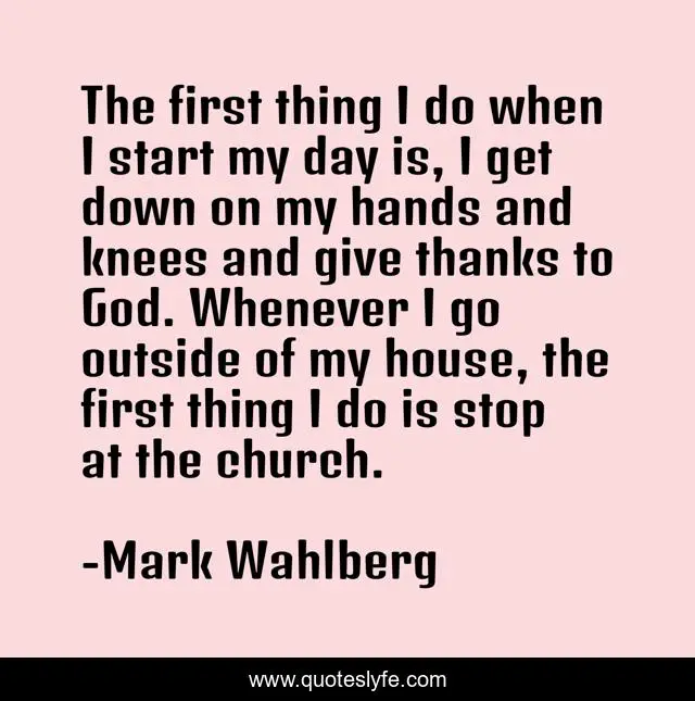 This page presents the quote "The first thing I do when I start my day is, I get down on my hands and knees and give thanks to God. Whenever I go outside of my house, the first thing I do is stop at the church.". Author of this quote is Mark Wahlberg. This quote is about god, day, start,.