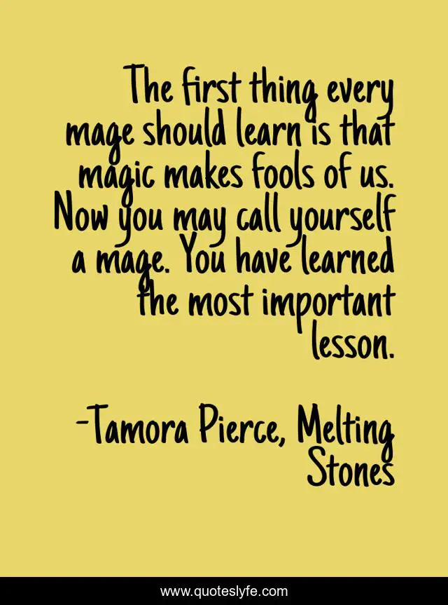 This page presents the quote "The first thing every mage should learn is that magic makes fools of us. Now you may call yourself a mage. You have learned the most important lesson.". Author of this quote is Tamora Pierce, Melting Stones. This quote is about fool, evvy, myrrhtide, magic, lesson,.