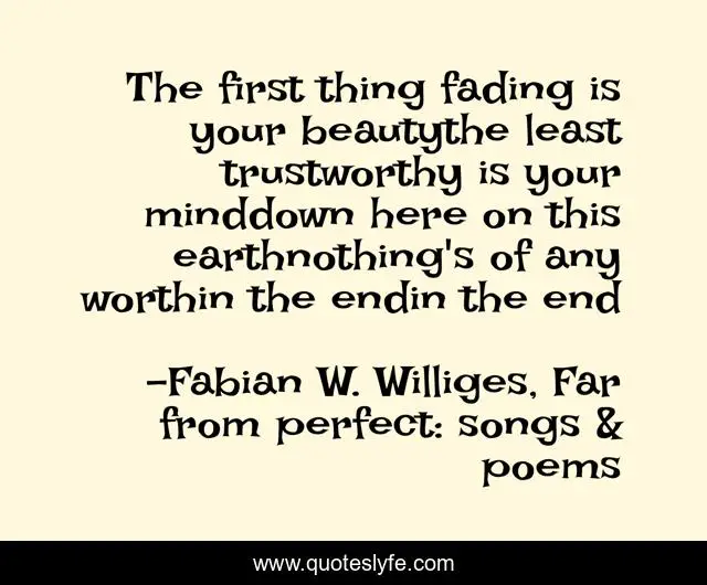 This page presents the quote "The first thing fading is your beautythe least trustworthy is your minddown here on this earthnothing's of any worthin the endin the end". Author of this quote is Fabian W. Williges, Far from perfect: songs & poems. This quote is about death, end-of-world, beauty, end, mind, religion, fading-beauty, end-of-days,.