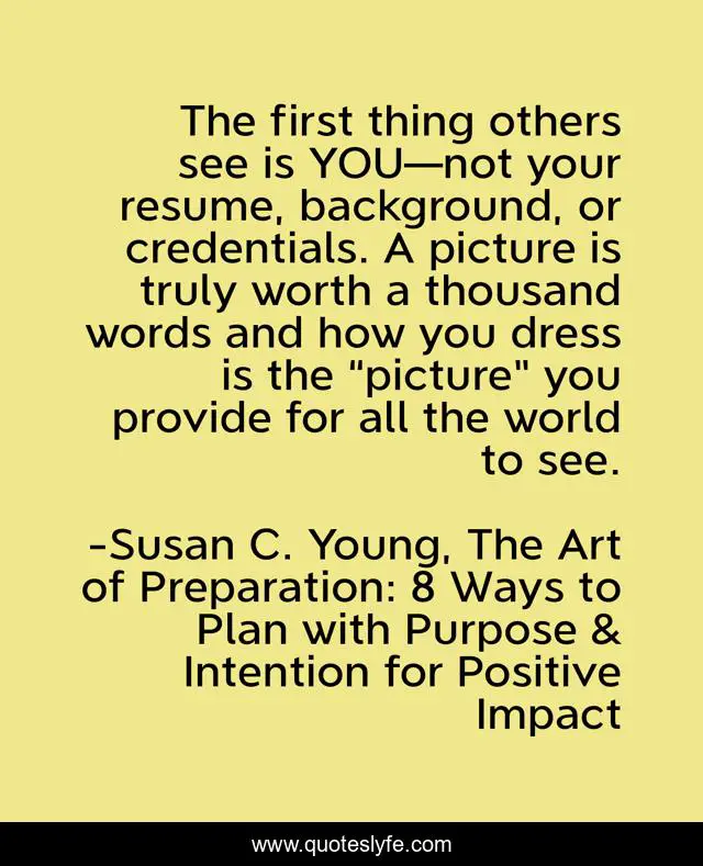This page presents the quote "The first thing others see is YOU—not your resume, background, or credentials. A picture is truly worth a thousand words and how you dress is the “picture” you provide for all the world to see.". Author of this quote is Susan C. Young, The Art of Preparation: 8 Ways to Plan with Purpose & Intention for Positive Impact. This quote is about success, relationship, communication-skills, branding, attitude, behaviour, quotes-by-susan-c-young, dress-for-success, susan-young,.