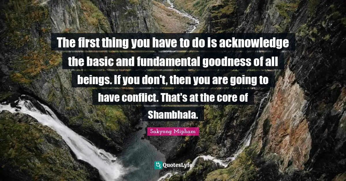 This page presents the quote "The first thing you have to do is acknowledge the basic and fundamental goodness of all beings. If you don't, then you are going to have conflict. That's at the core of Shambhala.". Author of this quote is Sakyong Mipham. This quote is about firsts, acknowledge, conflict, fundamentals, core, goodness,.