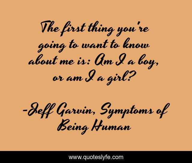 This page presents the quote "The first thing you're going to want to know about me is: Am I a boy, or am I a girl?". Author of this quote is Jeff Garvin, Symptoms of Being Human. This quote is about gender, transgender, trans, nonbinary, gender-identity,.