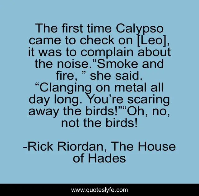 This page presents the quote "The first time Calypso came to check on [Leo], it was to complain about the noise.“Smoke and fire, ” she said. “Clanging on metal all day long. You’re scaring away the birds!”“Oh, no, not the birds!". Author of this quote is Rick Riordan, The House of Hades. This quote is about sarcasm, calypso, leo-valdez,.