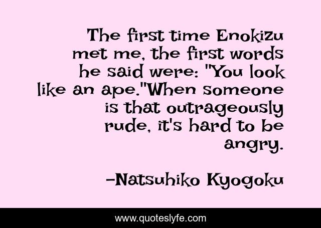 This page presents the quote "The first time Enokizu met me, the first words he said were: "You look like an ape."When someone is that outrageously rude, it's hard to be angry.". Author of this quote is Natsuhiko Kyogoku. This quote is about friends, natsuhiko-kyogoku, summer-of-the-ubume,.