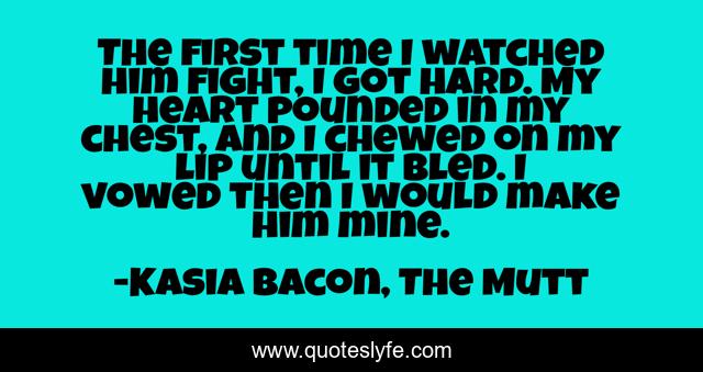 This page presents the quote "The first time I watched him fight, I got hard. My heart pounded in my chest, and I chewed on my lip until it bled. I vowed then I would make him mine.". Author of this quote is Kasia Bacon, The Mutt. This quote is about fixation, fantasy, mmromance, elves,.