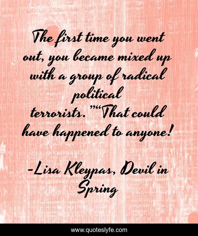 This page presents the quote "The first time you went out, you became mixed up with a group of radical political terrorists.”“That could have happened to anyone!". Author of this quote is Lisa Kleypas, Devil in Spring. This quote is about romance, funny, victorian-romance, comedy, historical-romance,.