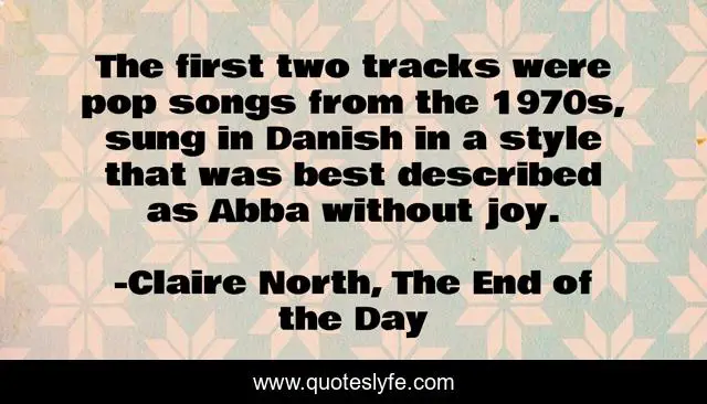 This page presents the quote "The first two tracks were pop songs from the 1970s, sung in Danish in a style that was best described as Abba without joy.". Author of this quote is Claire North, The End of the Day. This quote is about music, humour,.