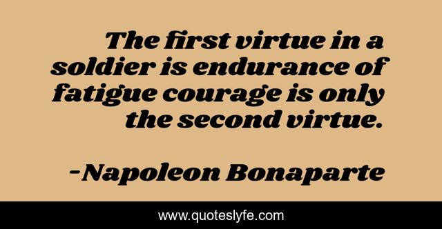 This page presents the quote "The first virtue in a soldier is endurance of fatigue courage is only the second virtue.". Author of this quote is Napoleon Bonaparte. This quote is about courage, bravery,.