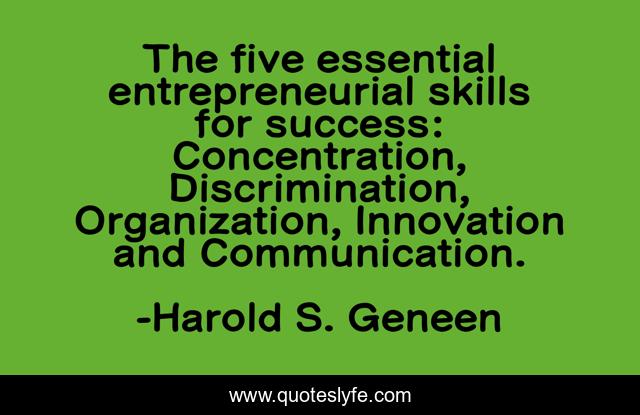 This page presents the quote "The five essential entrepreneurial skills for success: Concentration, Discrimination, Organization, Innovation and Communication.". Author of this quote is Harold S. Geneen. This quote is about success, innovation,.