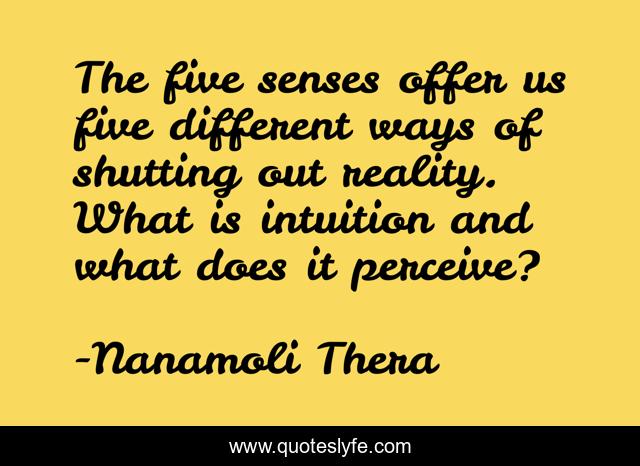 This page presents the quote "The five senses offer us five different ways of shutting out reality. What is intuition and what does it perceive?". Author of this quote is Nanamoli Thera. This quote is about senses, reality,.