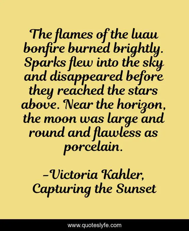 This page presents the quote "The flames of the luau bonfire burned brightly. Sparks flew into the sky and disappeared before they reached the stars above. Near the horizon, the moon was large and round and flawless as porcelain.". Author of this quote is Victoria Kahler, Capturing the Sunset. This quote is about fire, luau, bonfire, stars, moon,.