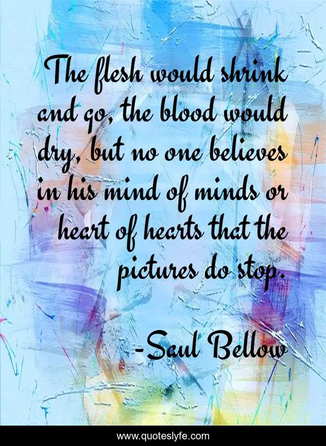 This page presents the quote "The flesh would shrink and go, the blood would dry, but no one believes in his mind of minds or heart of hearts that the pictures do stop.". Author of this quote is Saul Bellow. This quote is about life-and-death, death-and-dying, realization,.