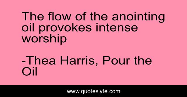 This page presents the quote "The flow of the anointing oil provokes intense worship". Author of this quote is Thea Harris, Pour the Oil. This quote is about anointing-power, anointing, worship,.