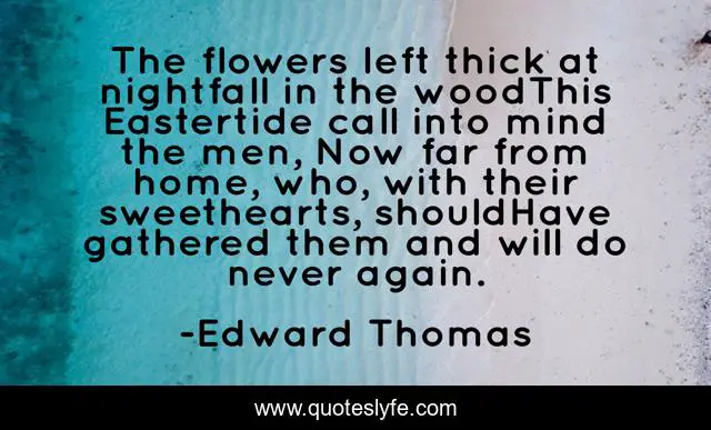 This page presents the quote "The flowers left thick at nightfall in the woodThis Eastertide call into mind the men, Now far from home, who, with their sweethearts, shouldHave gathered them and will do never again.". Author of this quote is Edward Thomas. This quote is about sacrifice, easter, war, world-war-one,.