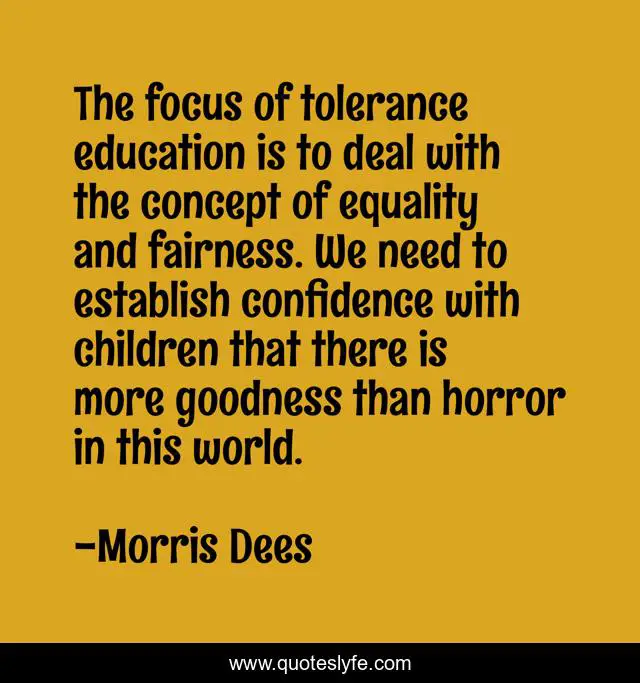 This page presents the quote "The focus of tolerance education is to deal with the concept of equality and fairness. We need to establish confidence with children that there is more goodness than horror in this world.". Author of this quote is Morris Dees. This quote is about education, children,.