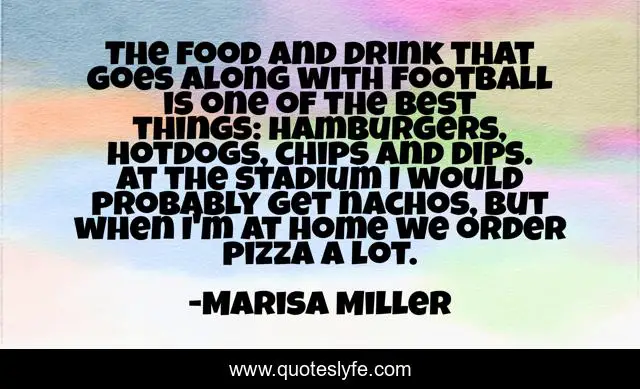 This page presents the quote "The food and drink that goes along with football is one of the best things: hamburgers, hotdogs, chips and dips. At the stadium I would probably get nachos, but when I'm at home we order pizza a lot.". Author of this quote is Marisa Miller. This quote is about home, football, best,.