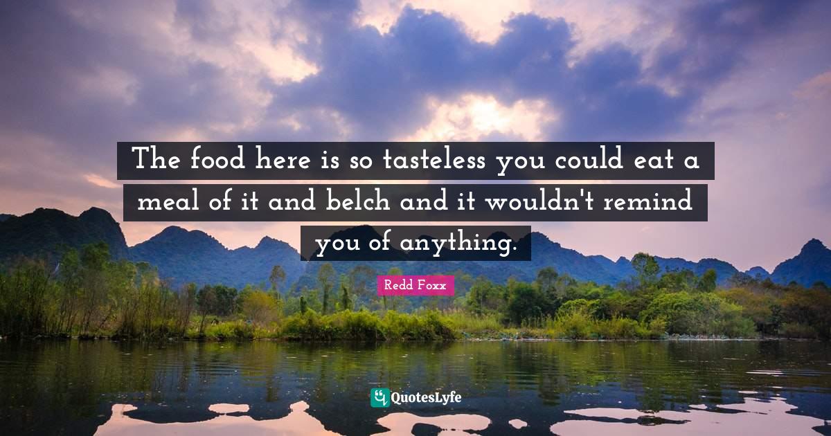 This page presents the quote "The food here is so tasteless you could eat a meal of it and belch and it wouldn't remind you of anything.". Author of this quote is Redd Foxx. This quote is about food, meals, cooking,.