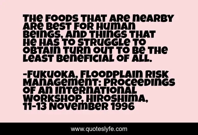 This page presents the quote "The foods that are nearby are best for human beings, and things that he has to struggle to obtain turn out to be the least beneficial of all.". Author of this quote is Fukuoka, Floodplain Risk Management: Proceedings of an International Workshop, Hiroshima, 11-13 November 1996. This quote is about food, natural, enviroment,.