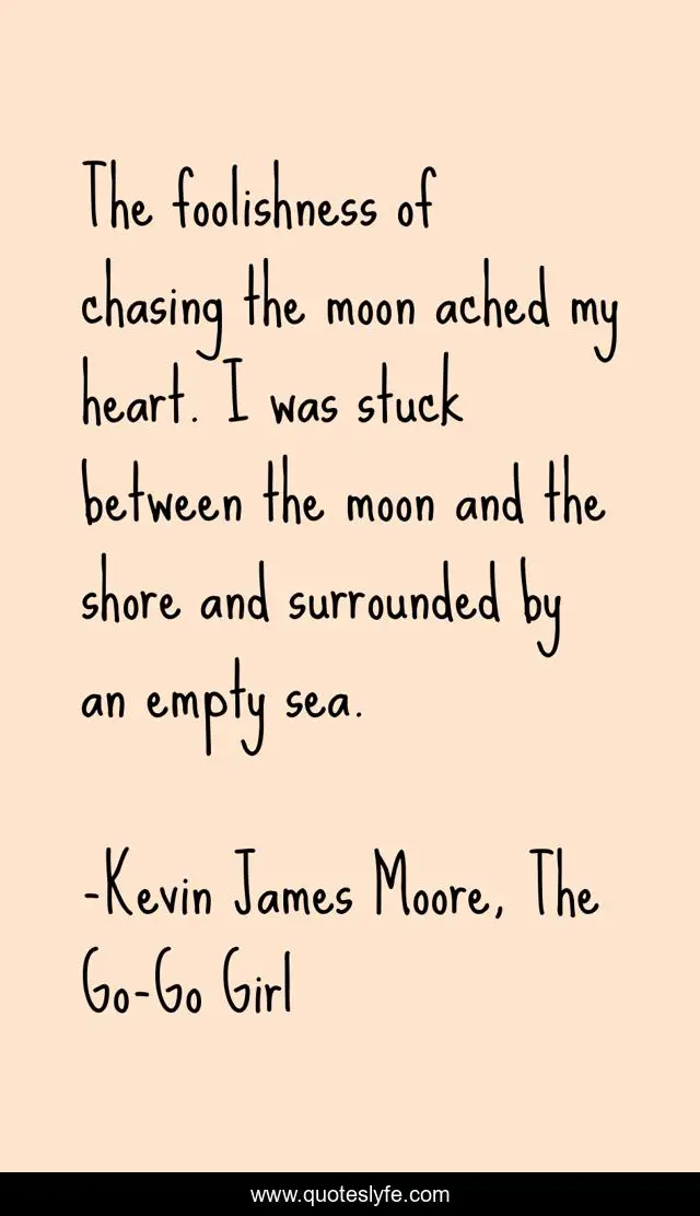 This page presents the quote "The foolishness of chasing the moon ached my heart. I was stuck between the moon and the shore and surrounded by an empty sea.". Author of this quote is Kevin James Moore, The Go-Go Girl. This quote is about chasing, foolishness, lost, sea,.