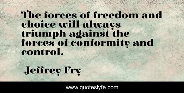 This page presents the quote "The forces of freedom and choice will always triumph against the forces of conformity and control.". Author of this quote is Jeffrey Fry. This quote is about control, choic, freedom, against, forces, always, conformity, triumph,.