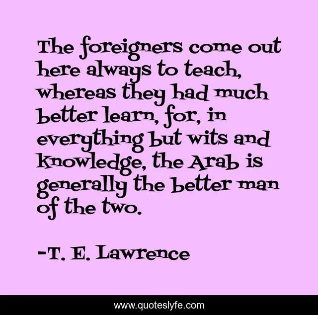 This page presents the quote "The foreigners come out here always to teach, whereas they had much better learn, for, in everything but wits and knowledge, the Arab is generally the better man of the two.". Author of this quote is T. E. Lawrence. This quote is about better, man, learn,.