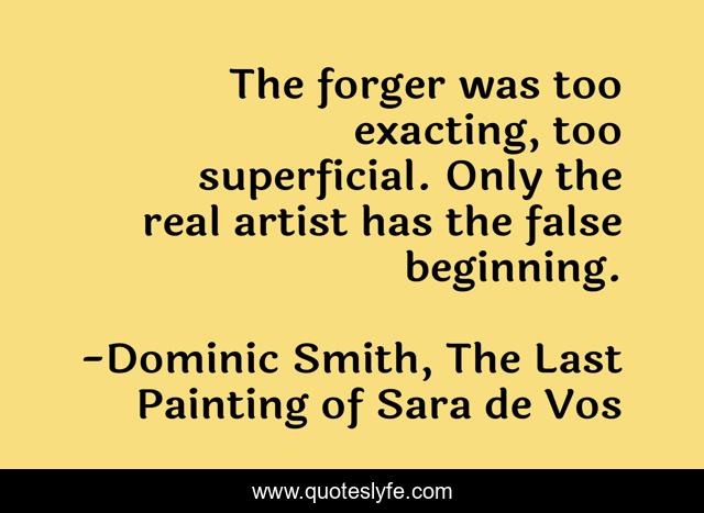 This page presents the quote "The forger was too exacting, too superficial. Only the real artist has the false beginning.". Author of this quote is Dominic Smith, The Last Painting of Sara de Vos. This quote is about forgery, art,.