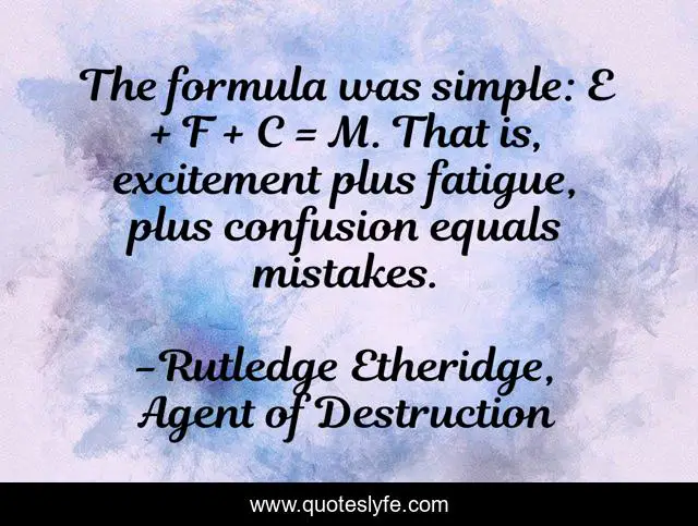 This page presents the quote "The formula was simple: E + F + C = M. That is, excitement plus fatigue, plus confusion equals mistakes.". Author of this quote is Rutledge Etheridge, Agent of Destruction. This quote is about mistakes, fatigue,.