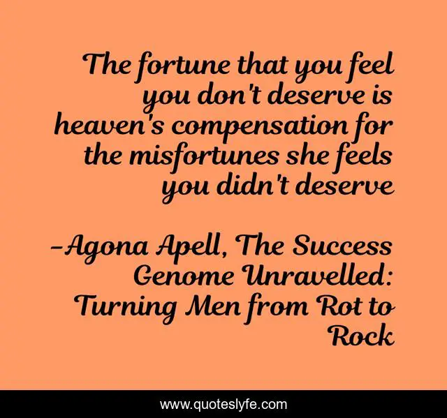 This page presents the quote "The fortune that you feel you don't deserve is heaven's compensation for the misfortunes she feels you didn't deserve". Author of this quote is Agona Apell, The Success Genome Unravelled: Turning Men from Rot to Rock. This quote is about misfortune, fortune, success, blessings, life-lessons, successful-living, happiness,.