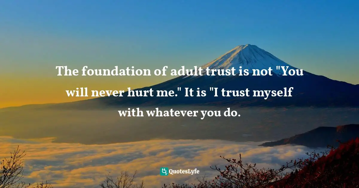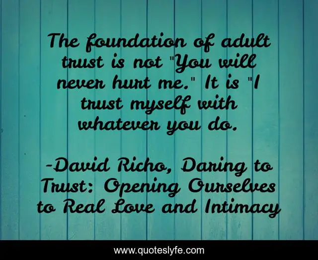 This page presents the quote "The foundation of adult trust is not "You will never hurt me." It is "I trust myself with whatever you do.". Author of this quote is David Richo, Daring to Trust: Opening Ourselves to Real Love and Intimacy. This quote is about relationships, love, daring-to-trust, david-richo, nonfiction, friendship, affection,.