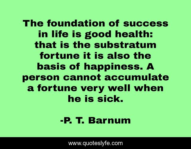 This page presents the quote "The foundation of success in life is good health: that is the substratum fortune it is also the basis of happiness. A person cannot accumulate a fortune very well when he is sick.". Author of this quote is P. T. Barnum. This quote is about life, health, success,.