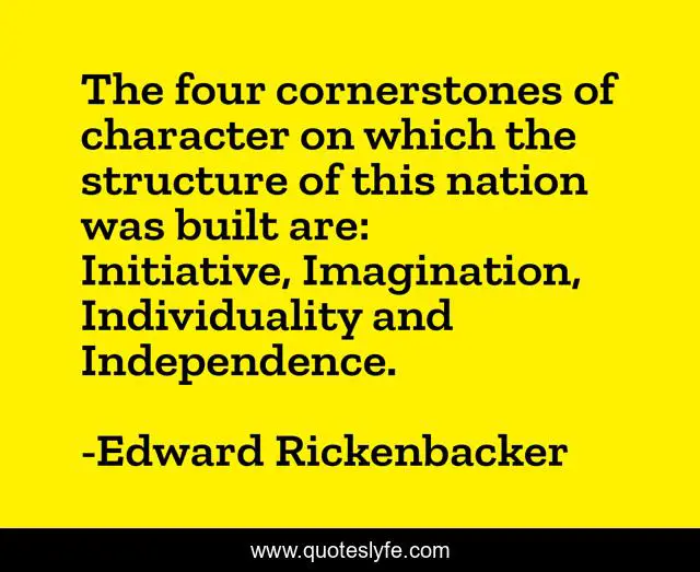 This page presents the quote "The four cornerstones of character on which the structure of this nation was built are: Initiative, Imagination, Individuality and Independence.". Author of this quote is Edward Rickenbacker. This quote is about imagination, individuality, initiative, indpendence, character,.