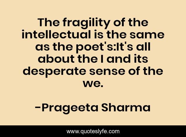 This page presents the quote "The fragility of the intellectual is the same as the poet's:It's all about the I and its desperate sense of the we.". Author of this quote is Prageeta Sharma. This quote is about desperation, poetry, identity, intellect,.