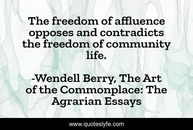 This page presents the quote "The freedom of affluence opposes and contradicts the freedom of community life.". Author of this quote is Wendell Berry, The Art of the Commonplace: The Agrarian Essays. This quote is about freedom, affluence, wealth, community,.