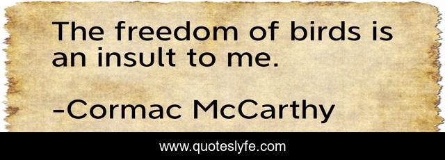 This page presents the quote "The freedom of birds is an insult to me.". Author of this quote is Cormac McCarthy. This quote is about freedom, birds, insult,.