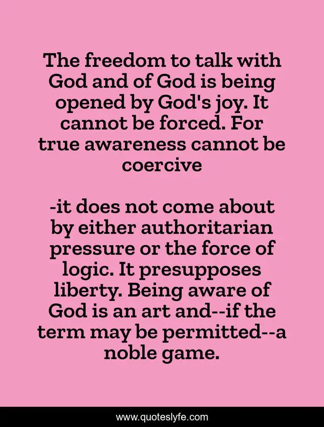This page presents the quote "The freedom to talk with God and of God is being opened by God's joy. It cannot be forced. For true awareness cannot be coercive". Author of this quote is it does not come about by either authoritarian pressure or the force of logic. It presupposes liberty. Being aware of God is an art and--if the term may be permitted--a noble game.. .