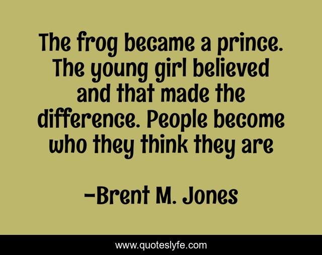 This page presents the quote "The frog became a prince. The young girl believed and that made the difference. People become who they think they are". Author of this quote is Brent M. Jones. This quote is about frogs, believe-in-yourself, become-a-prince,.