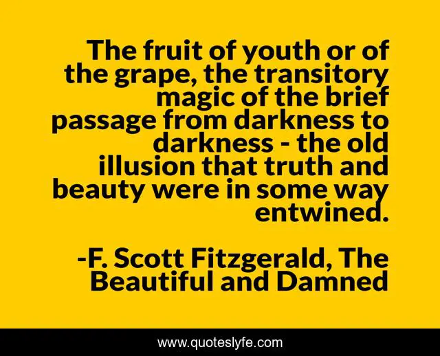 This page presents the quote "The fruit of youth or of the grape, the transitory magic of the brief passage from darkness to darkness - the old illusion that truth and beauty were in some way entwined.". Author of this quote is F. Scott Fitzgerald, The Beautiful and Damned. This quote is about youth, drinking, alcohol,.