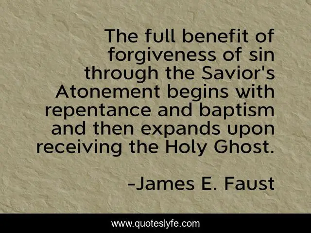 This page presents the quote "The full benefit of forgiveness of sin through the Savior's Atonement begins with repentance and baptism and then expands upon receiving the Holy Ghost.". Author of this quote is James E. Faust. This quote is about ghost, through, sin,.