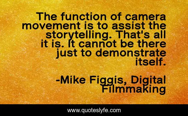 This page presents the quote "The function of camera movement is to assist the storytelling. That's all it is. It cannot be there just to demonstrate itself.". Author of this quote is Mike Figgis, Digital Filmmaking. This quote is about camera, film, filmmaking,.