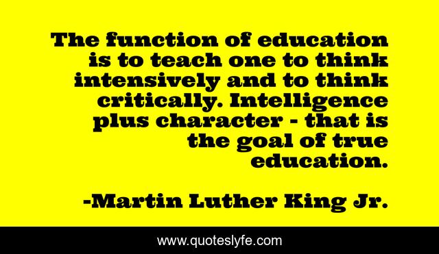 This page presents the quote "The function of education is to teach one to think intensively and to think critically. Intelligence plus character - that is the goal of true education.". Author of this quote is Martin Luther King Jr.. This quote is about writing-service, education,.
