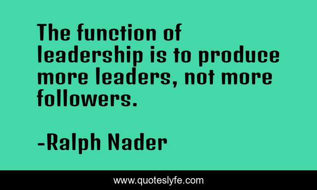 This page presents the quote "The function of leadership is to produce more leaders, not more followers.". Author of this quote is Ralph Nader. This quote is about followers, leaders, more,.