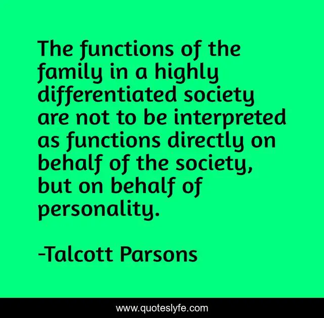 This page presents the quote "The functions of the family in a highly differentiated society are not to be interpreted as functions directly on behalf of the society, but on behalf of personality.". Author of this quote is Talcott Parsons. This quote is about society, personality,.