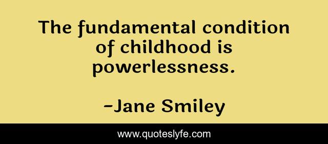 This page presents the quote "The fundamental condition of childhood is powerlessness.". Author of this quote is Jane Smiley. This quote is about childhood, child-rearing, children,.