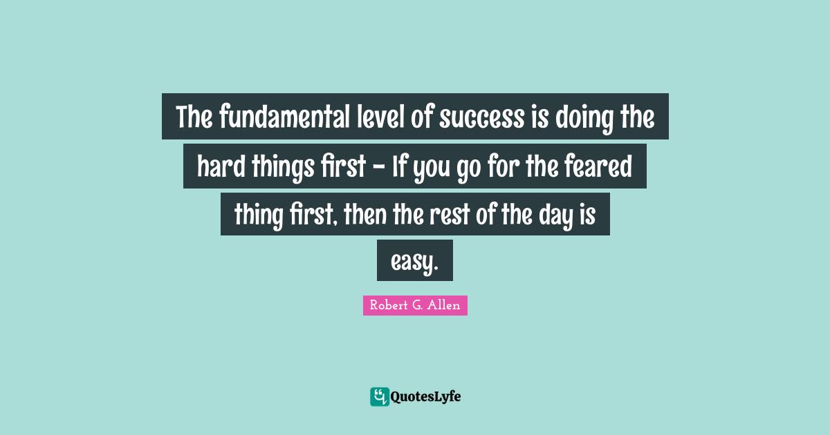 This page presents the quote "The fundamental level of success is doing the hard things first - If you go for the feared thing first, then the rest of the day is easy.". Author of this quote is Robert G. Allen. This quote is about insightful, easy, inspirational, hard things, success,.