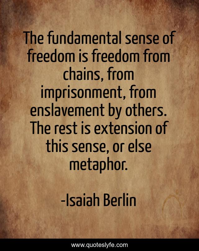 This page presents the quote "The fundamental sense of freedom is freedom from chains, from imprisonment, from enslavement by others. The rest is extension of this sense, or else metaphor.". Author of this quote is Isaiah Berlin. This quote is about chains, rest, sense,.