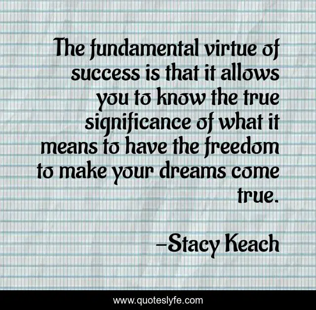 This page presents the quote "The fundamental virtue of success is that it allows you to know the true significance of what it means to have the freedom to make your dreams come true.". Author of this quote is Stacy Keach. This quote is about freedom, dreams, success,.