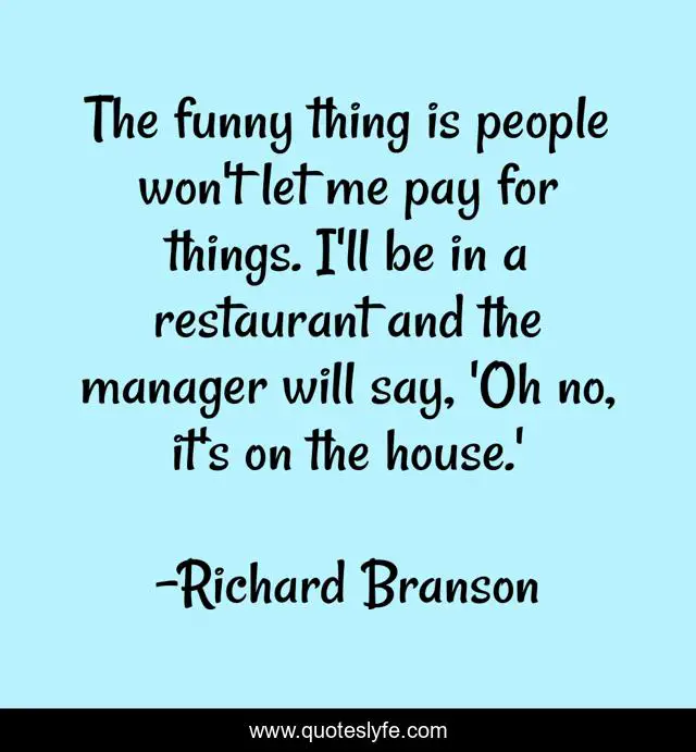 This page presents the quote "The funny thing is people won't let me pay for things. I'll be in a restaurant and the manager will say, 'Oh no, it's on the house.'". Author of this quote is Richard Branson. This quote is about me, people, restaurant,.