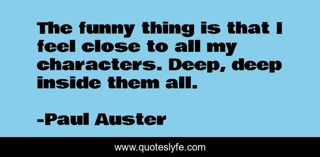 This page presents the quote "The funny thing is that I feel close to all my characters. Deep, deep inside them all.". Author of this quote is Paul Auster. This quote is about feel, inside, deep,.