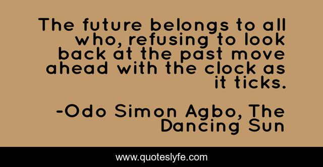 This page presents the quote "The future belongs to all who, refusing to look back at the past move ahead with the clock as it ticks.". Author of this quote is Odo Simon Agbo, The Dancing Sun. This quote is about how-do-we-stop-the-clock, poetry, poem,.